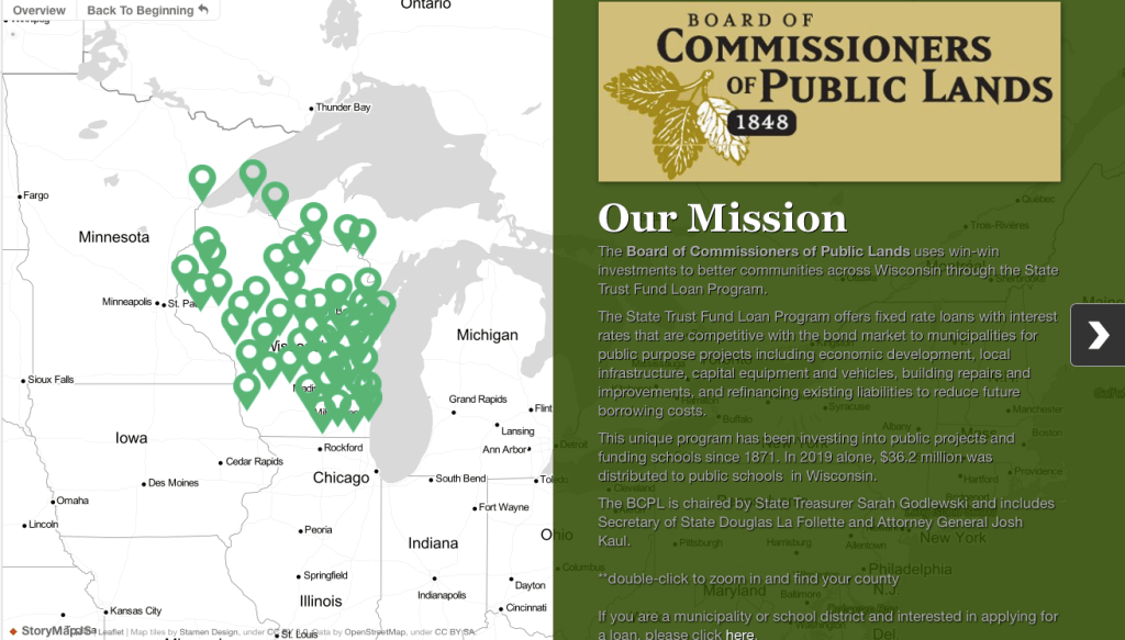 BCPL Map November 28, 2020Uncategorizedmollyjcarm click on the picture to use the interactive map I made during my internship with the Office of the Wisconsin State Treasurer Share this: Share on X (Opens in new window) X Share on Facebook (Opens in new window) Facebook Like Loading... Related